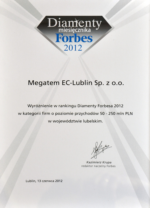 13 czerwca 2012 w Lublinie nasze przedsiębiorstwo otrzymało wyróżnienie w rankingu Diamenty Forbes 2012. Wyróżnienie otrzymują firmy które w ostatnich latach najbardziej dynamicznie zwiększały swoją wartość.