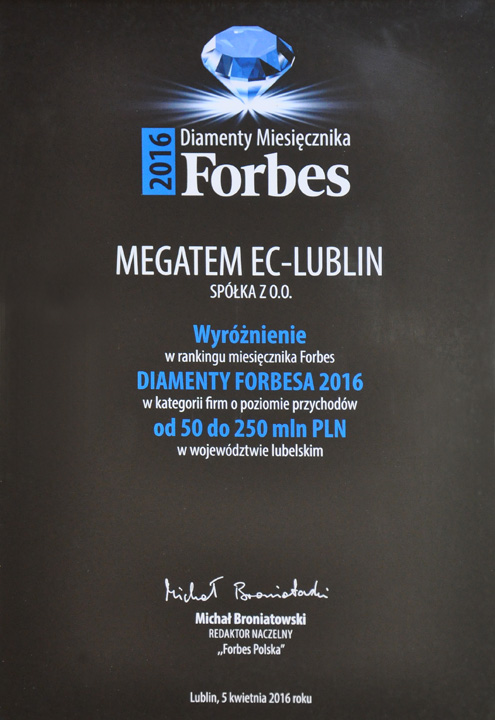 5 kwietnia 2016 w Lublinie nasze przedsiębiorstwo otrzymało wyróżnienie w rankingu Diamenty Forbes 2016. Wyróżnienie otrzymują firmy które najszybciej rozwijają się w województwie lubelskim.