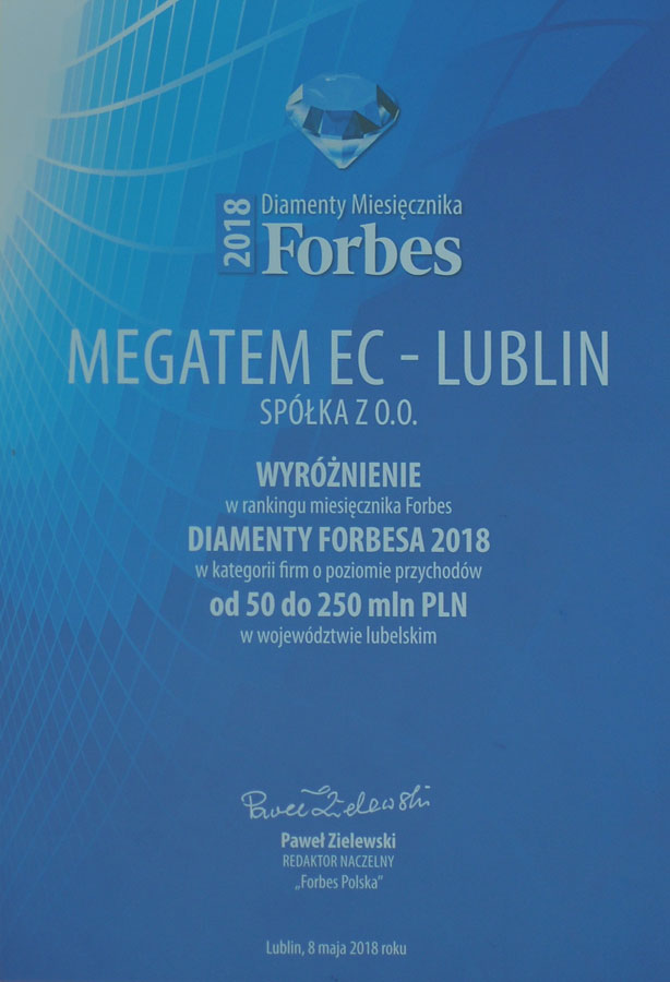 8 maja 2018 w Lublinie nasze przedsiębiorstwo otrzymało wyróżnienie w rankingu Diamenty Forbes 2018. Wyróżnienie otrzymują przedsiębiorstwa które należą do grona najszybciej rozwijających się w naszym kraju.