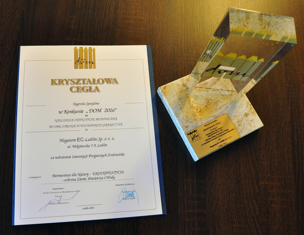 Megatem EC-Lublin otrzymał nagrodę specjalną w Konkursie "DOM 2016" na najlepszą inwestycję budowlaną po obu stronach wschodniej granicy za wdrażanie Inwestycji Przyjaznych Środowisku.