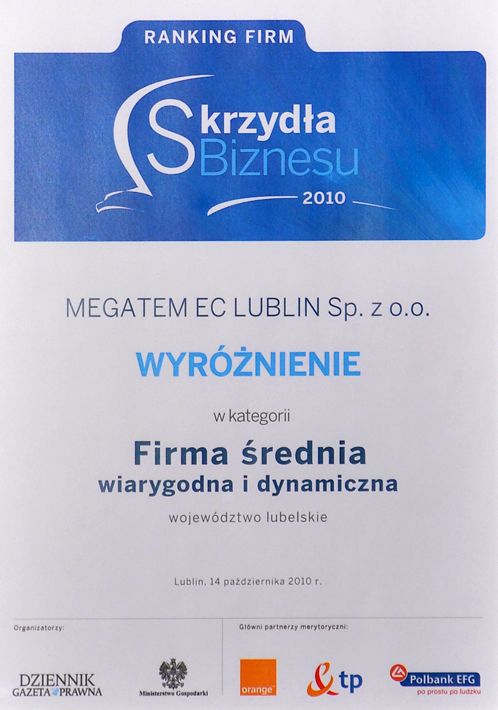 14 października 2010 w Kazimierzu Dolnym nasze przedsiębiorstwo otrzymało wyróżnienie w rankingu "Skrzydła Biznesu" dla województwa lubelskiego. Laureatami rankingu są przedsiębiorstwa które pomimo trudnych warunków rynkowych opierają się na innowacyjności.